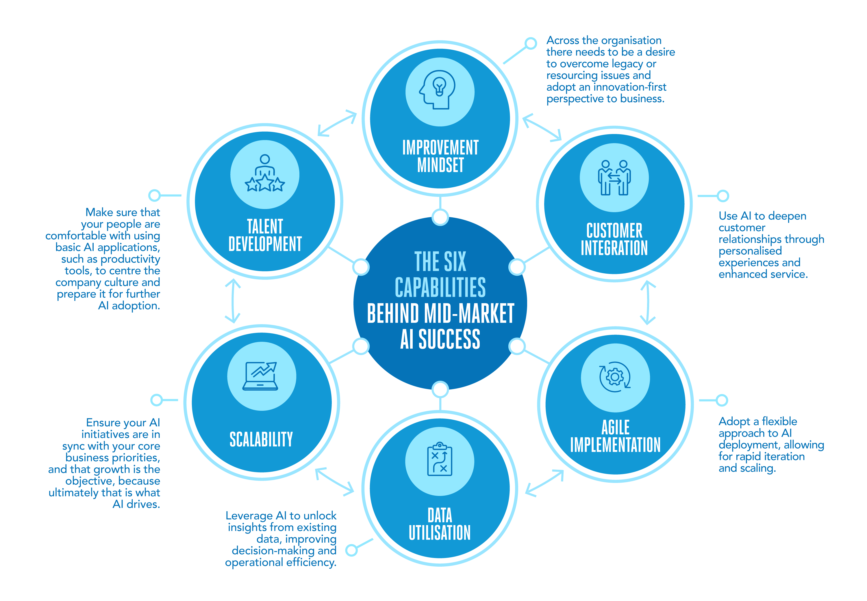 Before embarking on AI implementation, it’s crucial for a mid-market organisation to first ensure that it has a strong foundation. The path to successful AI adoption for mid-market businesses is supported by key capabilities such as strategy, talent, culture, governance, technology, and operations. These components work together to create an environment where AI can thrive and contribute to the company’s success.